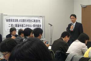 「秘密保全法」の法案化を完全に断念させようと、出版関連産業の労働者でつくる日本出版労働組合連合会(出版労連)が、国会内で集会。民主党の衆院議員といっしょに参加。集会では、大谷充委員長が「秘密保全法制の恐ろしさが知られていないのはマスコミ、報道の一翼を担うものとしてじくじたる思いだ。今国会での法案提出を見送るとの報道があるが、ここで反対の世論がしぼめば、相手の思うつぼだ」と主催者あいさつ。 前田能成副委員長は「福島第1原発事故では、組合員のフリーの記者が多数、現地で取材している。秘密保全法があった場合、こうした活動が制限され、私たちが目指す言論表現の自由が奪われてしまう」と訴えた。 また、日本雑誌協会の山了吉編集倫理委員長が「雑誌だからこそ、新聞、テレビよりも内幕に食い込み報道できることがある。そうした取材を秘密保全法制は『教唆』『扇動』として罪に問う可能性がある」と発言した。 未来えいごう、秘密保全法案を出させないようがんばりたい。 | ||||