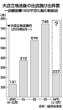 1990年6月 日米構造協議でアメリカに大規模小売店舗法(大店法)の大幅規制緩和を約束 1992年1月 大店法による出店調整期間を1年以内に短縮、地元商業者などとの協議機関を廃止 1994年5月 1000平方メートル以下の出店を原則自由に 1996年3月 規制緩和推進計画の改定で橋本内閣が大店法の制度見直しを決定 1997年5月 大店法審議会開始 1998年5月 大店法廃止決定、大店立地法制定 2000年6月 大店立地法施行 |